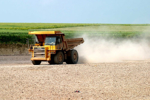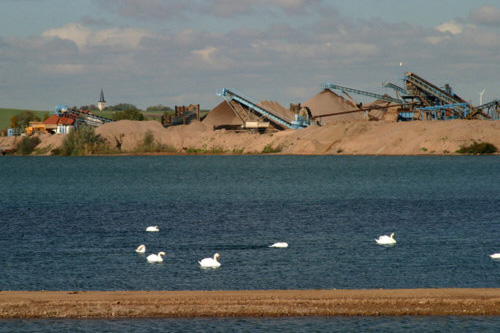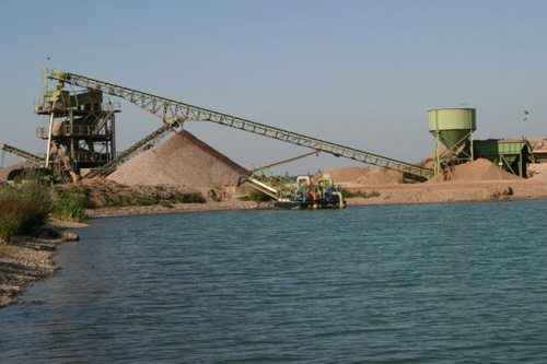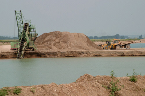 Nassabbau mit Eimerkettenbagger und Verladung auf Dumper